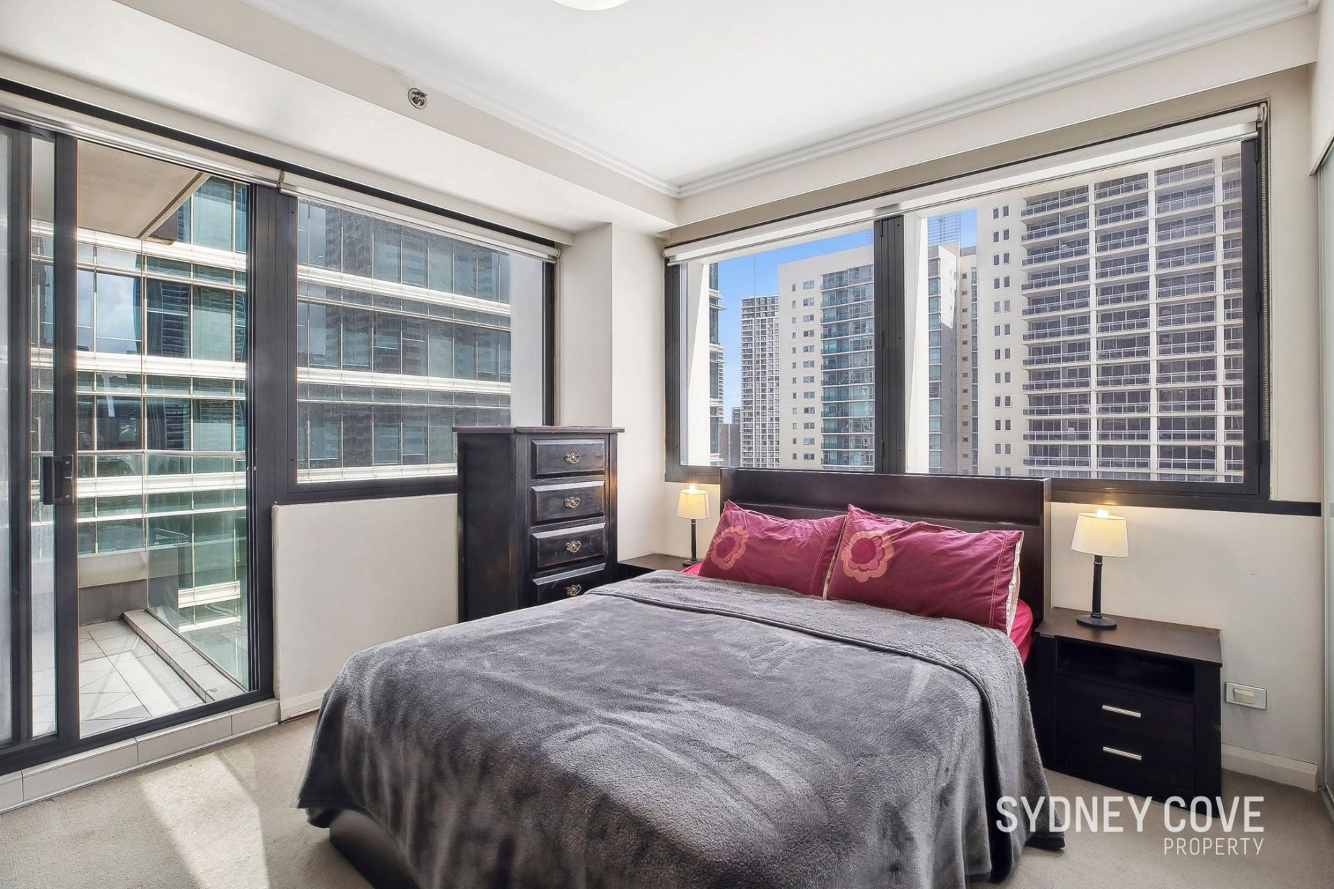 - King-sized bedroom with built-ins and access to the balcony